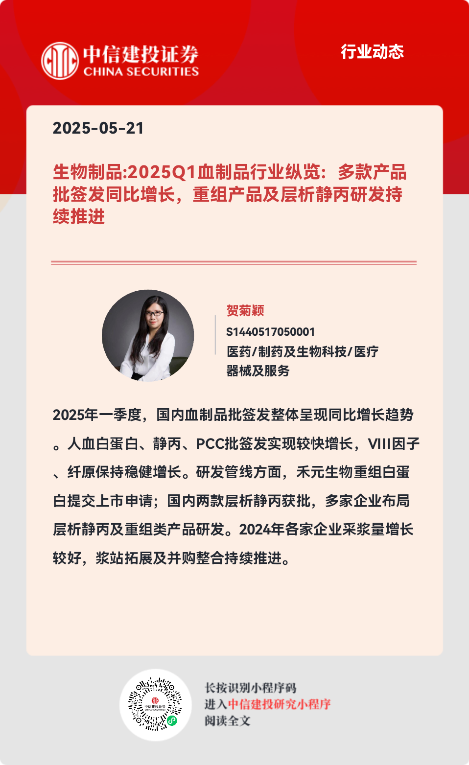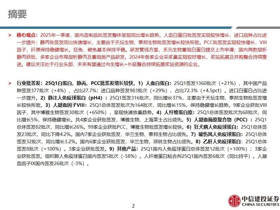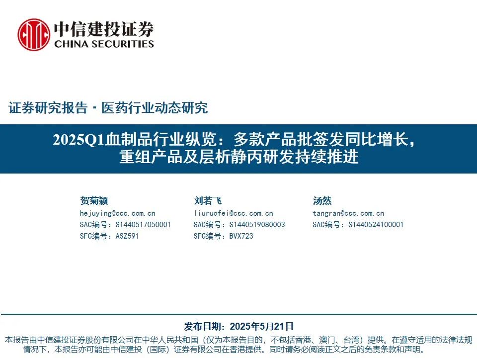 ]article_adlist-->证券研究报告名称:《生物制品:2025Q1血制品行业纵览:多款产品批签发同比增长,重组产品及层析静丙研发持续推进》