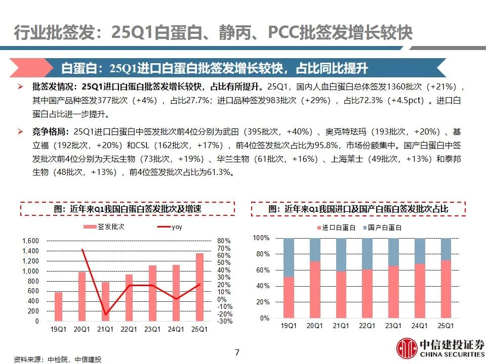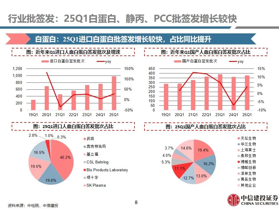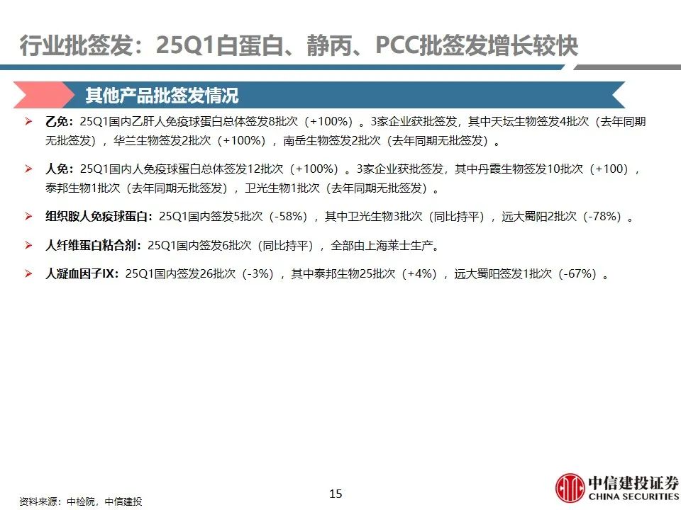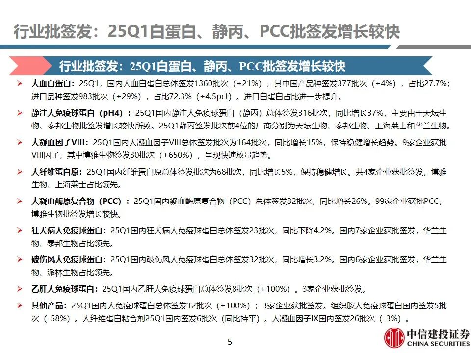 行业批签发:25Q1白蛋白、静丙、PCC批签发增长较快。1)人血白蛋白:25Q1签发1360批次(+21%),其中国产品种签发377批次(+4%),占比27.7%;进口品种签发983批次(+29%),占比72.3%(+4.5pct)。进口白蛋白占比进一步提升。2)静注人免疫球蛋白(pH4):25Q1签发316批次,同比增长37%,主要由于天坛生物、泰邦生物批签发增长较快所致。3)人凝血因子VIII:25Q1总体签发批次为164批次,同比增长15%,保持稳健增长趋势。9家企业获批VIII因子,其中博雅生物签发30批次(+650%),呈现快速放量趋势。4)人纤维蛋白原:25Q1总体签发批次为68批次,同比增长5%,保持稳健增长。共4家企业获批签发,博雅生物、上海莱士占比领先。5)人凝血酶原复合物(PCC):25Q1总体签发82批次,同比增长26%。99家企业获批PCC,博雅生物批签发增长较快。6)狂犬病人免疫球蛋白:25Q1总体签发23批次,同比下降4.2%。国内7家企业获批签发,华兰生物、泰邦生物占比领先。7)破伤风人免疫球蛋白:25Q1总体签发32批次,同比增长3.2%。国内6家企业获批签发,华兰生物、派林生物占比领先。8)乙肝人免疫球蛋白:25Q1总体签发8批次(+100%)。3家企业获批签发。9)其他产品:25Q1国内人免疫球蛋白总体签发12批次(+100%);3家企业获批签发。组织胺人免疫球蛋白国内签发5批次(-58%)。人纤维蛋白粘合剂25Q1国内签发6批次(同比持平)。人凝血因子IX国内签发26批次(-3%)。