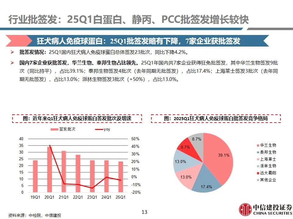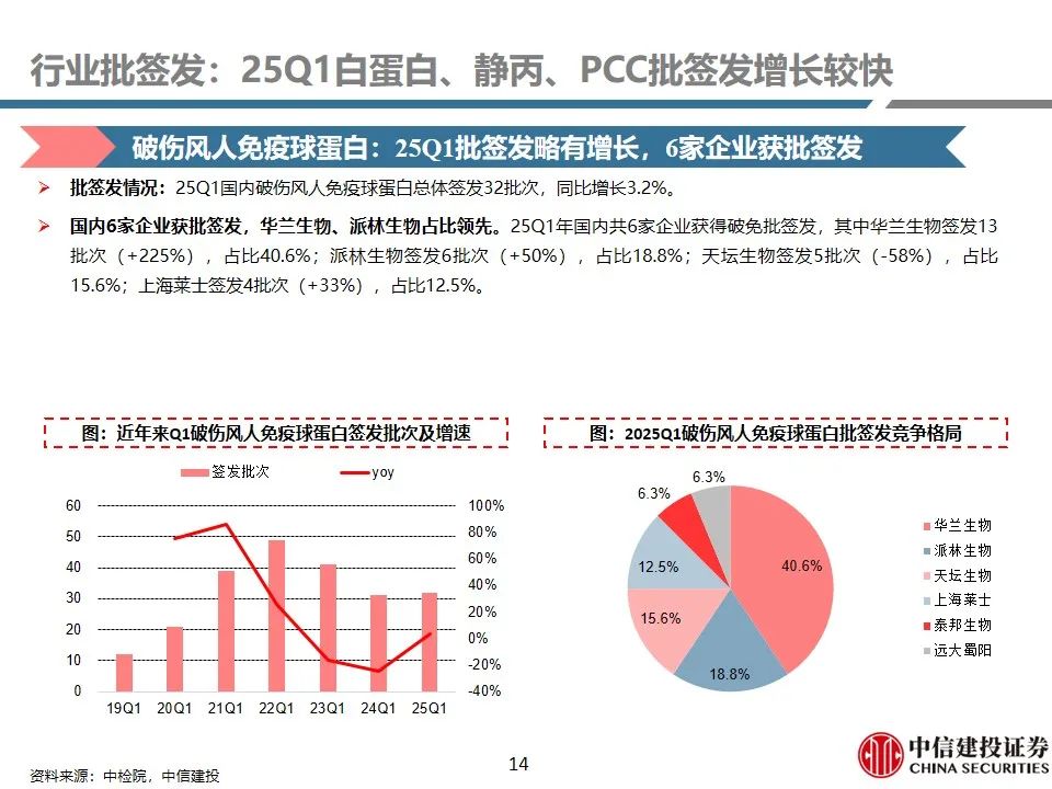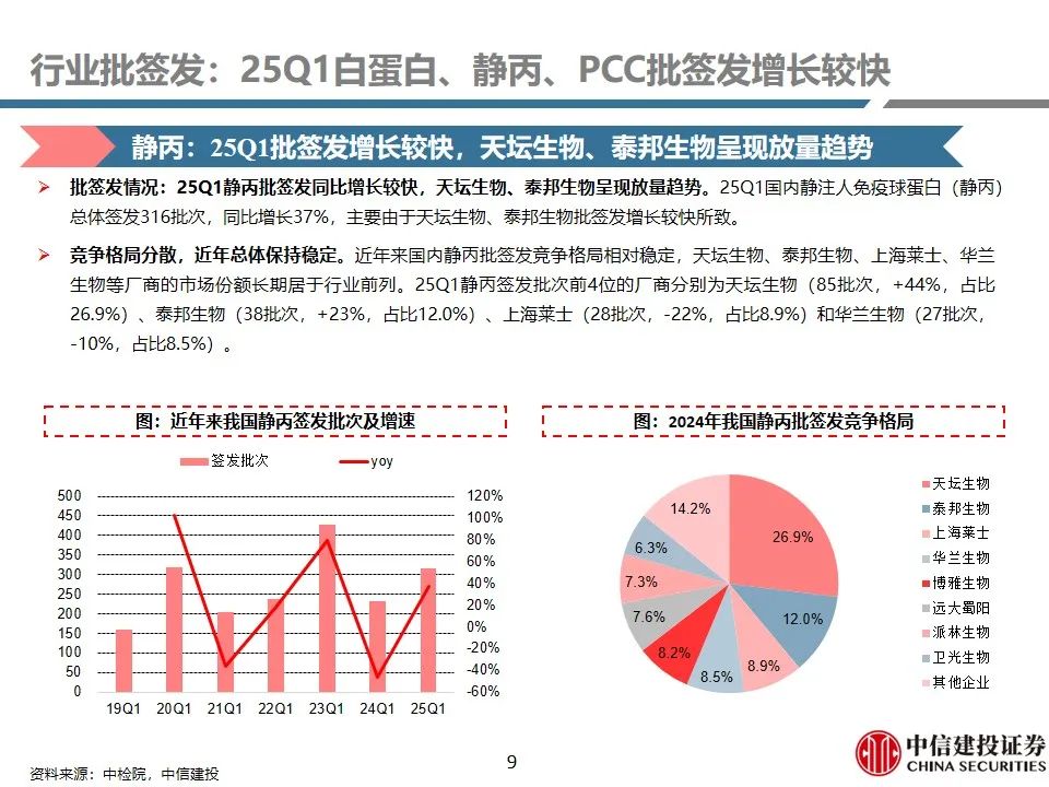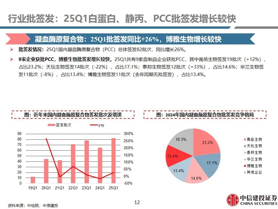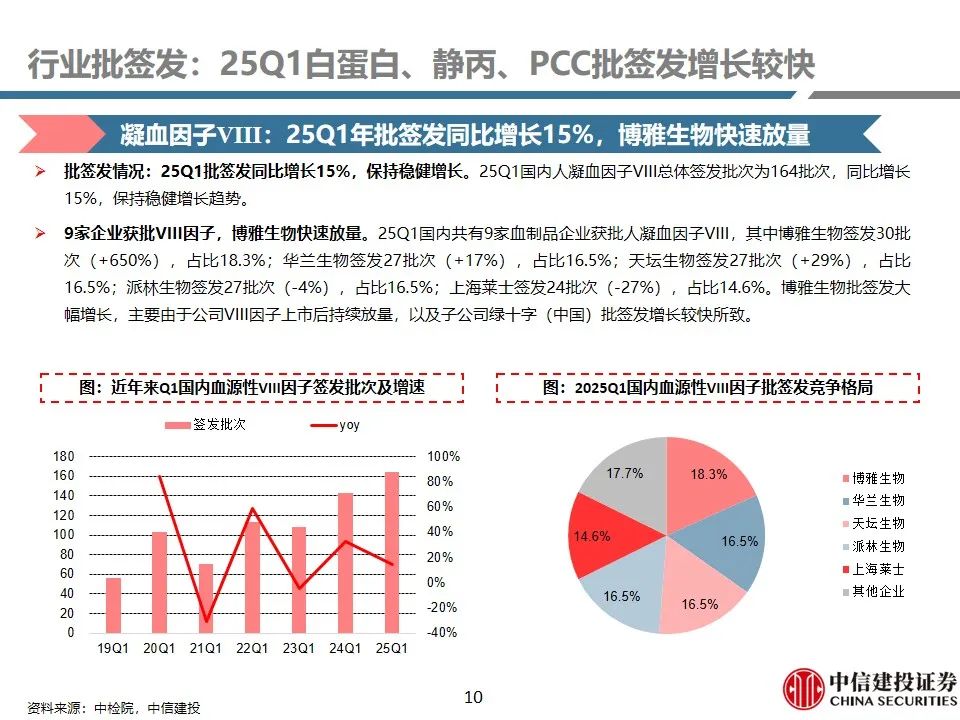 行业批签发:25Q1白蛋白、静丙、PCC批签发增长较快。1)人血白蛋白:25Q1签发1360批次(+21%),其中国产品种签发377批次(+4%),占比27.7%;进口品种签发983批次(+29%),占比72.3%(+4.5pct)。进口白蛋白占比进一步提升。2)静注人免疫球蛋白(pH4):25Q1签发316批次,同比增长37%,主要由于天坛生物、泰邦生物批签发增长较快所致。3)人凝血因子VIII:25Q1总体签发批次为164批次,同比增长15%,保持稳健增长趋势。9家企业获批VIII因子,其中博雅生物签发30批次(+650%),呈现快速放量趋势。4)人纤维蛋白原:25Q1总体签发批次为68批次,同比增长5%,保持稳健增长。共4家企业获批签发,博雅生物、上海莱士占比领先。5)人凝血酶原复合物(PCC):25Q1总体签发82批次,同比增长26%。99家企业获批PCC,博雅生物批签发增长较快。6)狂犬病人免疫球蛋白:25Q1总体签发23批次,同比下降4.2%。国内7家企业获批签发,华兰生物、泰邦生物占比领先。7)破伤风人免疫球蛋白:25Q1总体签发32批次,同比增长3.2%。国内6家企业获批签发,华兰生物、派林生物占比领先。8)乙肝人免疫球蛋白:25Q1总体签发8批次(+100%)。3家企业获批签发。9)其他产品:25Q1国内人免疫球蛋白总体签发12批次(+100%);3家企业获批签发。组织胺人免疫球蛋白国内签发5批次(-58%)。人纤维蛋白粘合剂25Q1国内签发6批次(同比持平)。人凝血因子IX国内签发26批次(-3%)。