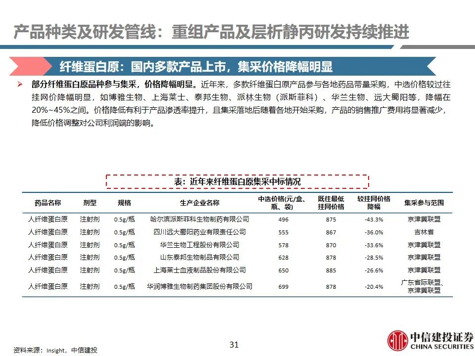产品种类及研发管线:重组产品及层析静丙研发持续推进。1)人血白蛋白:生产厂家众多,禾元生物重组白蛋白提交上市申请。2)静丙:国内两款高浓度层析静丙已上市,多家企业布局研发。3)凝血因子:分为血源性和重组产品,在研管线以重组产品为主。4)纤原:国内多款产品上市,集采价格降幅明显。5)PCC:主要用于治疗凝血因子缺乏,上市产品均为国内厂商。6)特免:种类众多,主要针对感染性疾病。