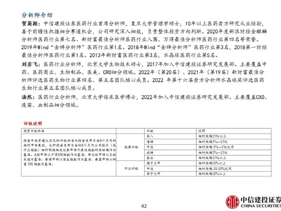 贺菊颖:中信建投证券医药行业首席分析师,复旦大学管理学硕士,10年以上医药卖方研究从业经验,善于前瞻性把握细分赛道机会,公司研究深入细致,负责整体投资方向判断。